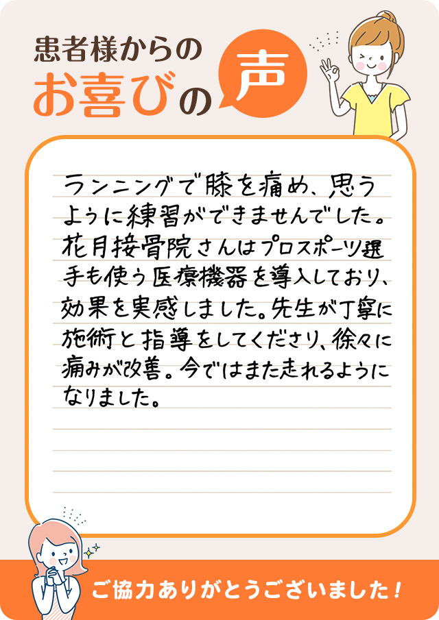 子供が病院でオスグットと診断を受け、痛み止めを処方されましたがなかなか症状が改善されず困っておりました。知人に良い治療院があると伺い、花月接骨院を利用させて頂き、初回の治療が元気に走り回るようになり本当にびっくりしました。病院とは異なり、症状に対しての説明や自宅でできる予防法等を素人の私にも分かりやすく解説して頂きました。本当にオススメできる治療院です。