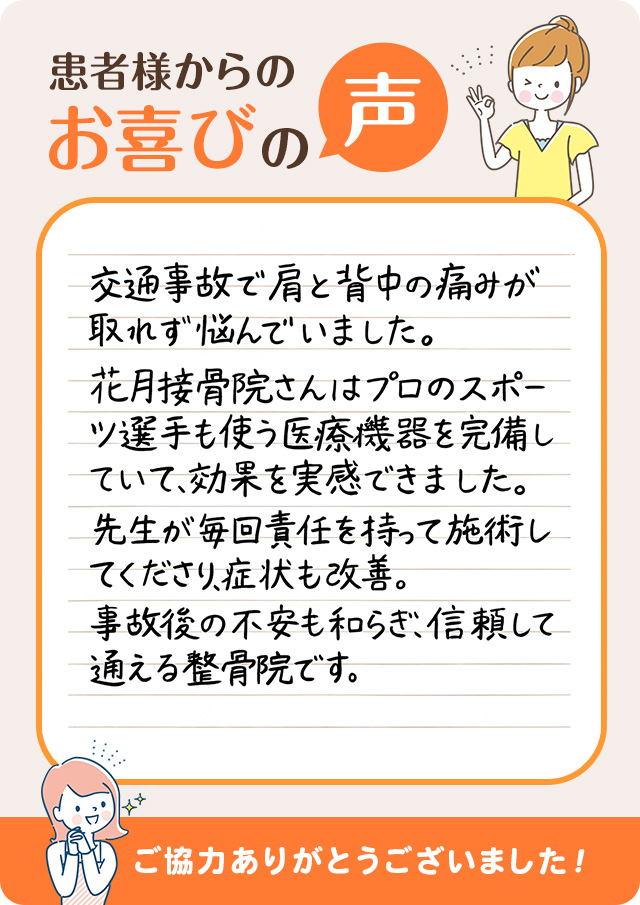 交通事故で肩と背中の痛みが取れず悩んでいました。花月接骨院さんはプロのスポーツ選手も使う医療機器を完備していて、効果を実感できました。先生が毎回責任を持って施術してくださり、症状も改善。事故後の不安も和らぎ、信頼して通える整骨院です。